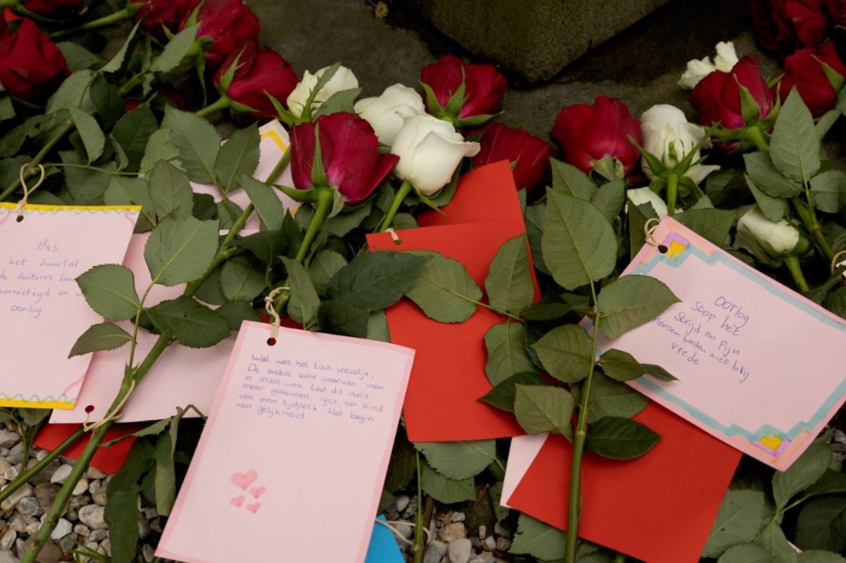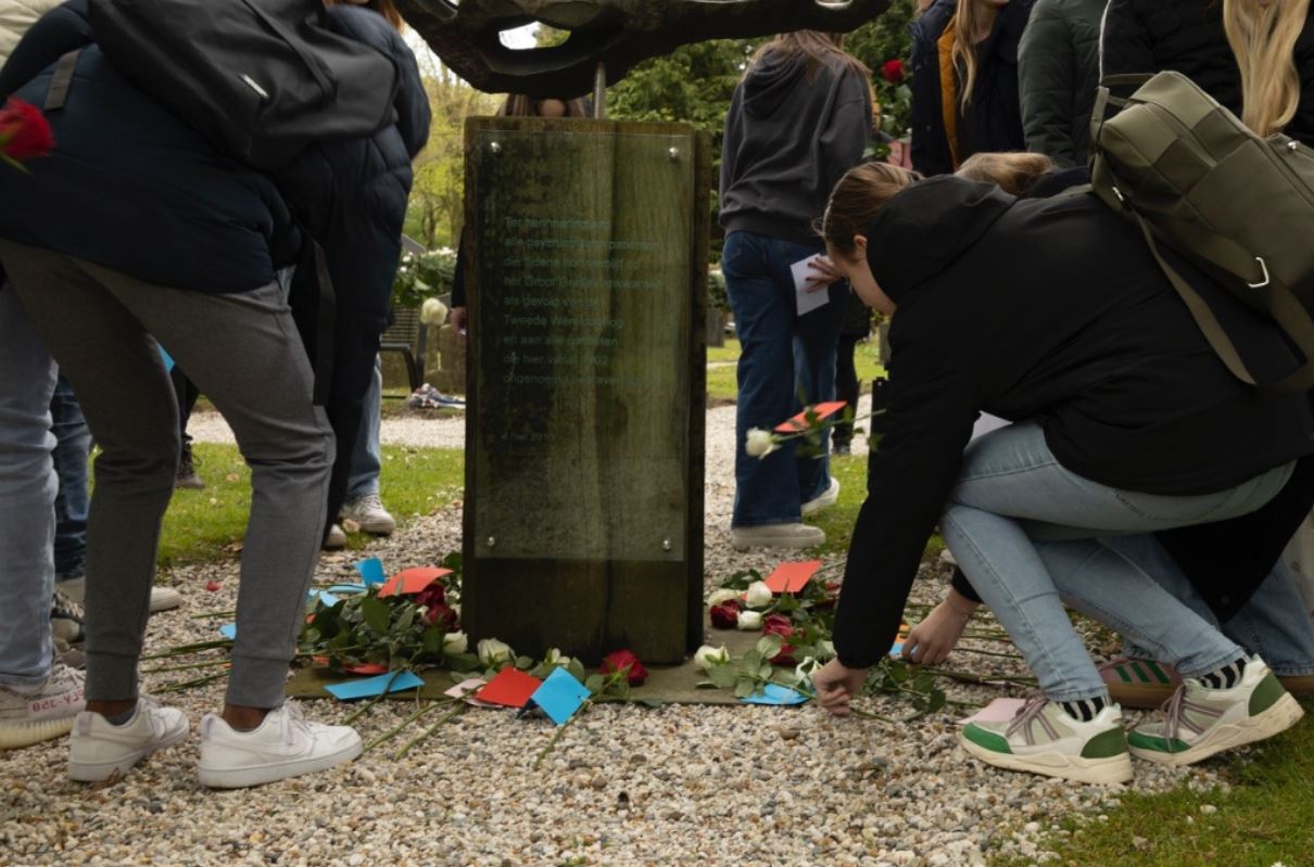 Na een minuut stilte legde mevrouw Boswinkel, geholpen door enkele leerlingen, een bloemstuk bij het monument. Namens de school legden leerlingen ook een bloemstuk, terwijl andere organisaties en aanwezigen eveneens bloemen bij het monument plaatsten. De leerlingen van Kindcentrum Adriaan van den Ende hadden steentjes bewerkt en beschreven, die ze ook bij het monument neerlegden.