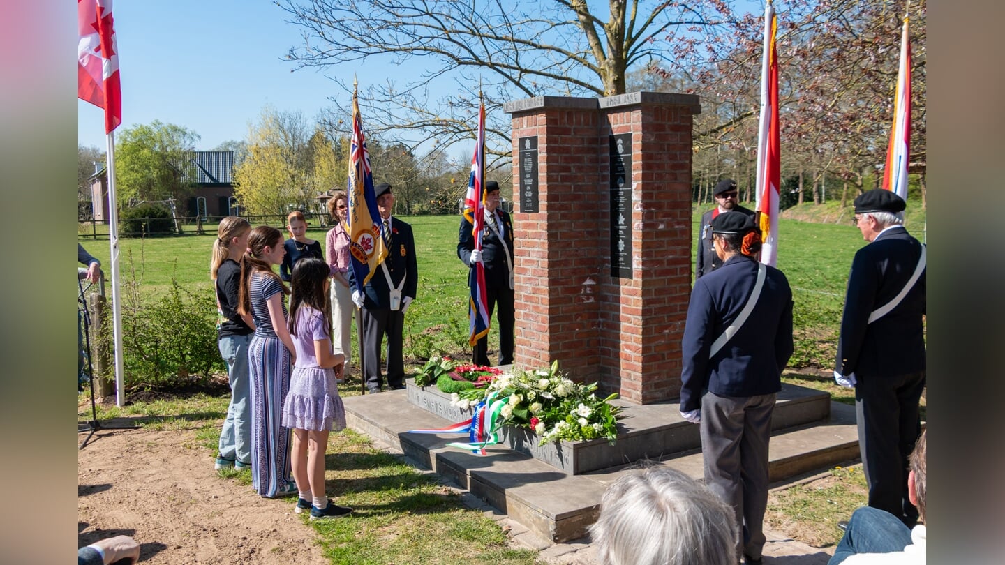 Het kruisje markeert de plek waar corporaal A.P. Periard op 4 april 1945 als één van de eerste Canadese militairen is gesneuveld bij de bevrijding van Leesten. De herdenking vond plaats samen met de adoptieschool Kindcentrum Lea Dasberg, groepen 6.
